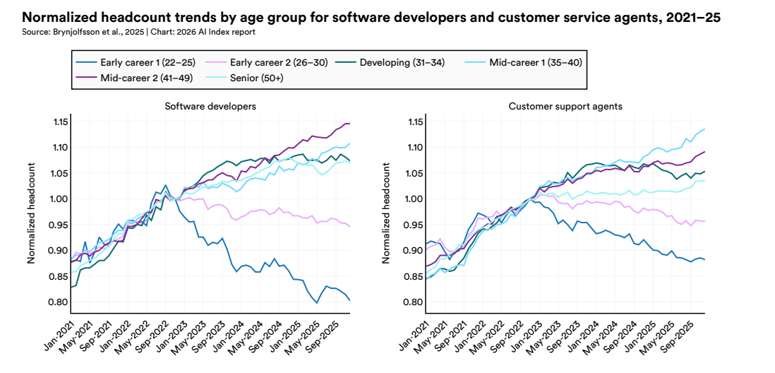 2021–2025 年软件开发人员与客服岗位按年龄组划分的标准化用工趋势,图源:斯坦福2026年AI指数报告