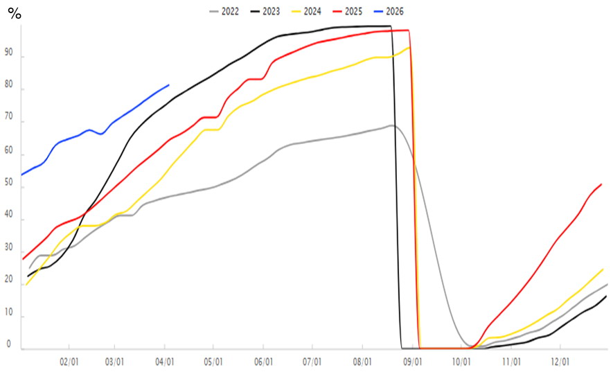 美国棉花主产区天气异常,是当前国际棉价最核心的上涨动力,也是影响全球供给的关键变量之一。美国是全球主要棉花出口国,出口量占全球贸易量比重超35%,其供给波动直接决定全球可贸易量松紧程度。目前,得克萨斯州等核心棉花种植区干旱覆盖比例超90%,部分区域达到极端干旱等级,土壤墒情严重偏低,对春播出苗、苗期长势及最终单产构成实质性威胁。从种植结构看,玉米、大豆等竞争作物收益优势扩大,棉农种植意愿偏弱,进一步加剧了2026/2027年度棉花种植面积收缩预期。