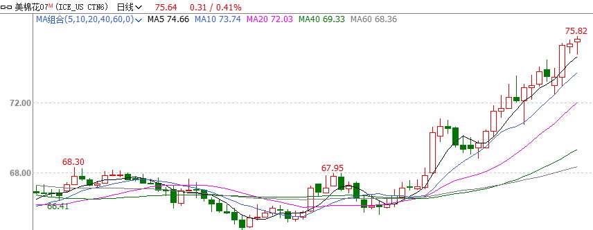 本轮国际棉价上行具备清晰的驱动链条。宏观层面,中东冲突推升原油价格,美元指数回落至近一个月低位,以美元计价的美棉出口竞争力显著提升。同时,原油价格上涨大幅推高涤纶、粘胶等化纤生产成本,棉花比价优势持续凸显,下游纺企配棉比例上调,形成需求端正向反馈。从基本面看,市场交易重心已从2025/2026年度转向2026/2027年度。美国农业部(USDA)4月供需报告虽上调2025/2026年度全球棉花产量预估,但并未改变市场对2026/2027年度供给收缩的定价逻辑。同时,美棉周度出口销售数据持续偏强,基金净空持仓下降,农产品板块价格整体上行,共同推动ICE棉花期价突破关键阻力位。