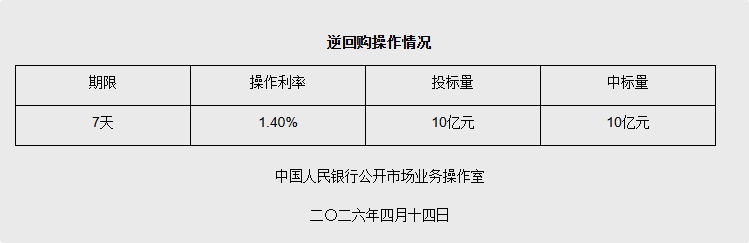 中新网4月14日电据央行网站消息,2026年4月14日中国人民银行以固定利率、数量招标方式开展了10亿元7天期逆回购操作,全额满足了一级交易商需求。具体情况如下: