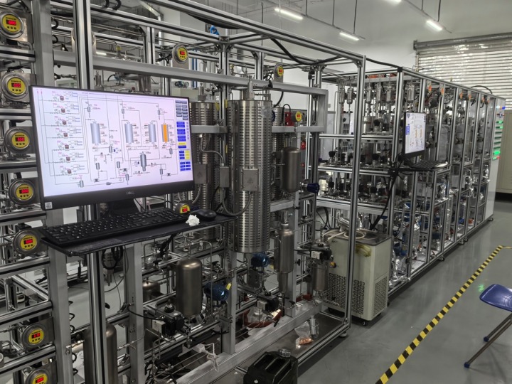 样品展台旁,是一套长约10米的100%油脂基SAF生产实验装置。它配备多个反应器,大部分反应器用于将“地沟油”转化为100%SAF所需核心组分,另外两个反应器用于生产配套组分。