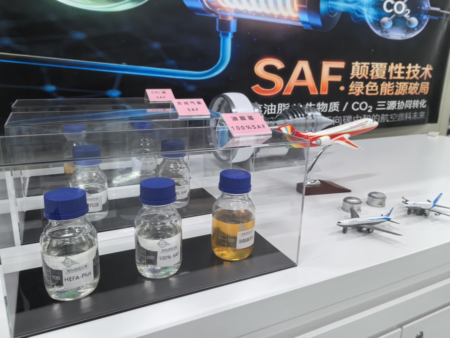 走进可再生碳资源科技工程中心,记者看到多个样品瓶,其中一个透明瓶贴着“100%-SAF”标签,另一个棕色瓶标注“100%SAF核心组分”。华东师大教授赵晨介绍,两份样品均以废弃油脂为原料,经特定工艺转化为不同核心组分,按适当比例调和后,就能得到适配国产航空发动机、专供国产飞机试用的100%油脂基SAF。