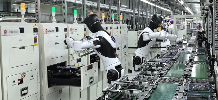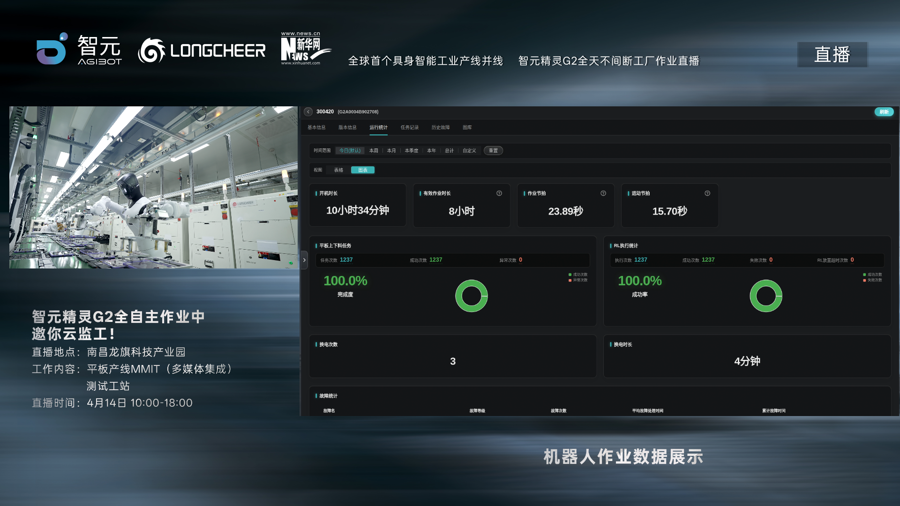 4月14日,龙旗科技南昌平板制造工厂开启长达8小时的真实产线作业直播,两台智元具身智能机器人精灵G2以“正式员工”身份,在平板电脑产线上连续作业。据悉,这也是全球首个具身智能工业产线规模化落地。