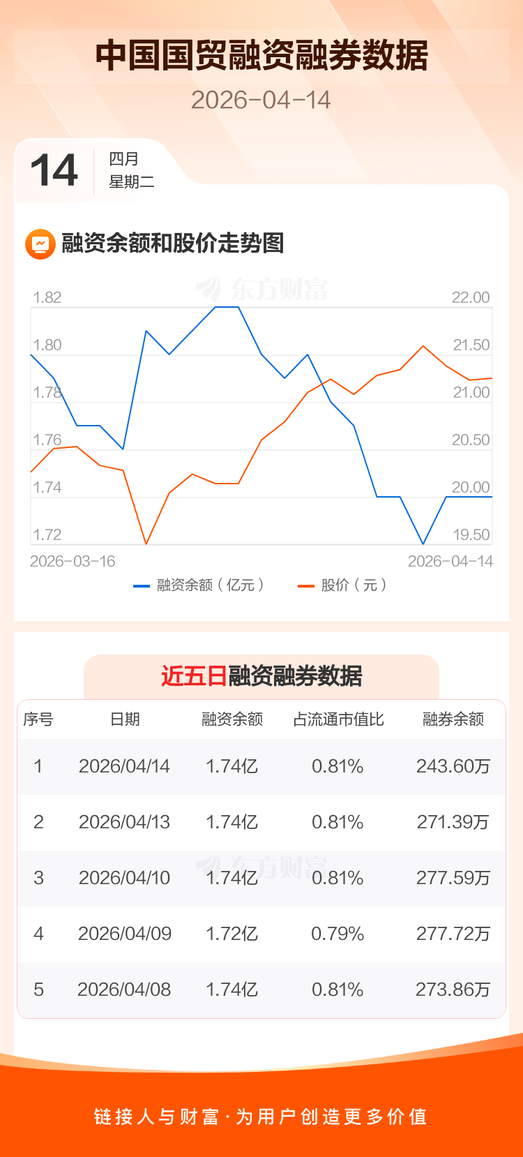 交易所最新数据显示,中国国贸于2026年4月14日获融资买入123.44万元,融资偿还151.83万元,当日融资净偿还28.39万元。目前,该股融资余额1.74亿,占流通市值比例为0.81%。
