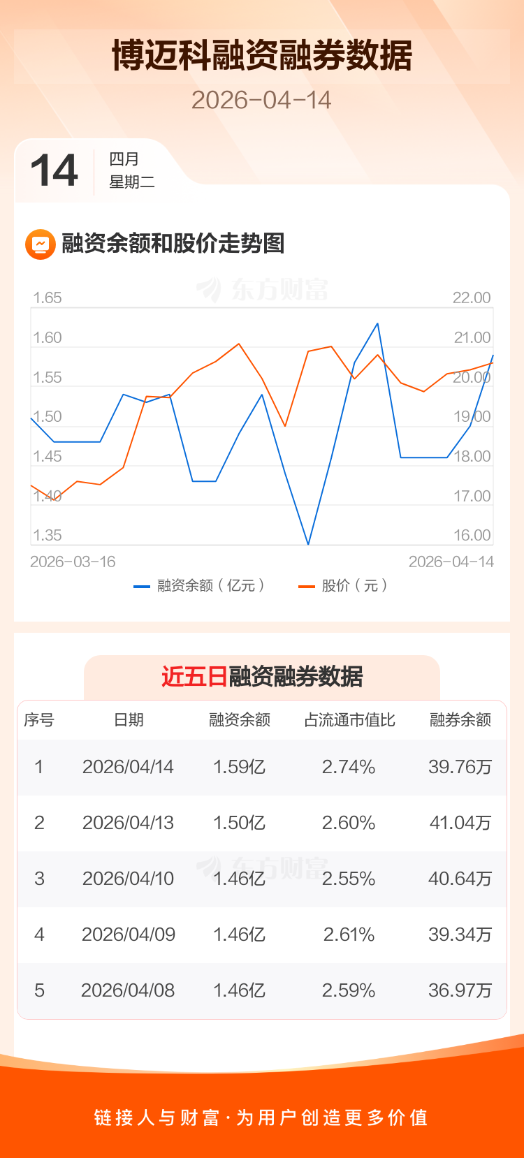 交易所最新数据显示,博迈科于2026年4月14日获融资买入2444.39万元,融资偿还1520.79万元,当日融资净买入923.59万元。目前,该股融资余额1.59亿,占流通市值比例为2.74%。