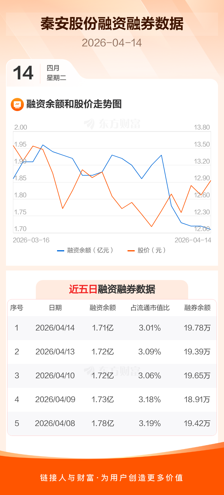 交易所最新数据显示,秦安股份于2026年4月14日获融资买入310.25万元,融资偿还431.79万元,当日融资净偿还121.54万元。目前,该股融资余额1.71亿,占流通市值比例为3.01%。