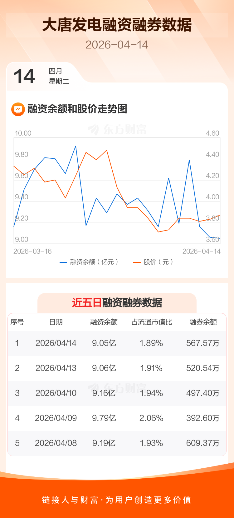 交易所最新数据显示,大唐发电于2026年4月14日获融资买入4320.58万元,融资偿还4374.00万元,当日融资净偿还53.42万元。目前,该股融资余额9.05亿,占流通市值比例为1.89%。