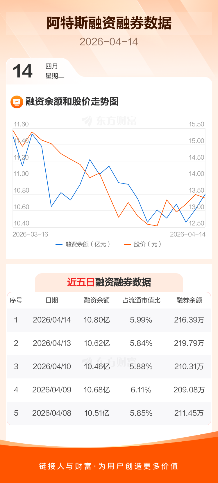 交易所最新数据显示,阿特斯于2026年4月14日获融资买入7258.98万元,融资偿还5407.99万元,当日融资净买入1850.99万元。目前,该股融资余额10.80亿,占流通市值比例为5.99%。
