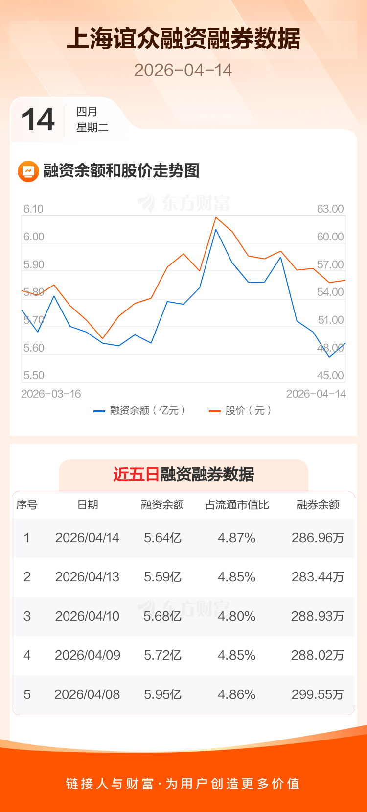 交易所最新数据显示,上海谊众于2026年4月14日获融资买入1915.32万元,融资偿还1369.56万元,当日融资净买入545.77万元。目前,该股融资余额5.64亿,占流通市值比例为4.87%。