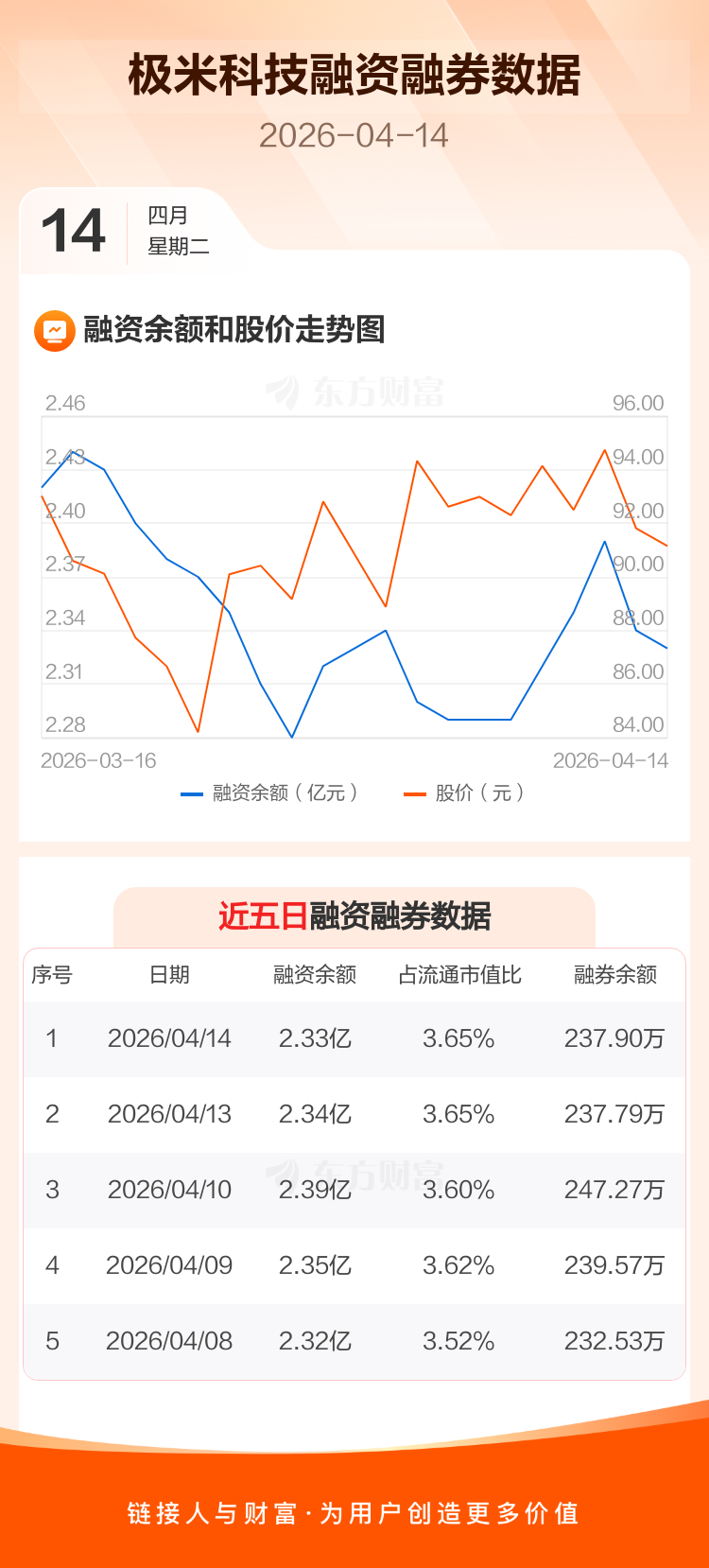 交易所最新数据显示,极米科技于2026年4月14日获融资买入415.41万元,融资偿还534.07万元,当日融资净偿还118.66万元。目前,该股融资余额2.33亿,占流通市值比例为3.65%。