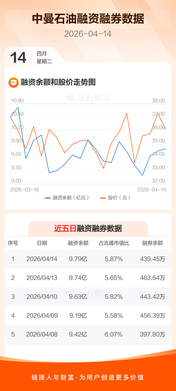 交易所最新数据显示,中曼石油于2026年4月14日获融资买入1.22亿元,融资偿还1.17亿元,当日融资净买入583.98万元。目前,该股融资余额9.79亿,占流通市值比例为5.87%。