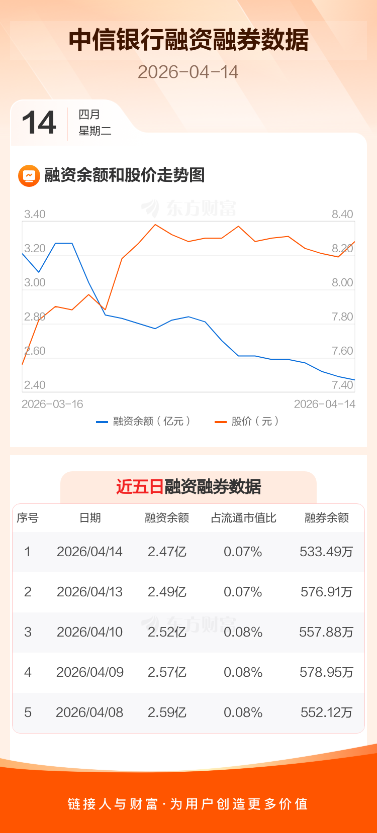 交易所最新数据显示,中信银行于2026年4月14日获融资买入596.71万元,融资偿还798.70万元,当日融资净偿还201.99万元。目前,该股融资余额2.47亿,占流通市值比例为0.07%。