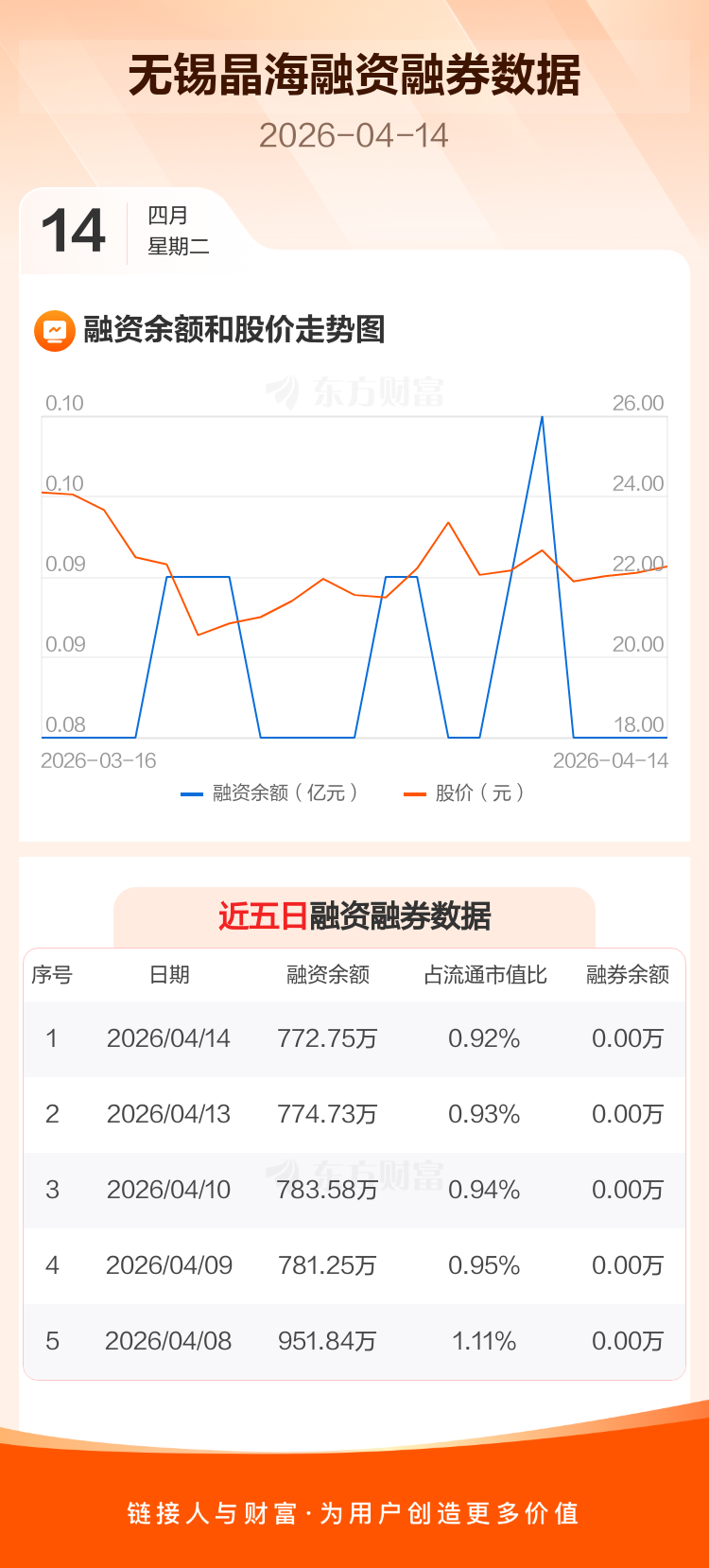 交易所最新数据显示,无锡晶海于2026年4月14日获融资买入17.76万元,融资偿还19.74万元,当日融资净偿还1.98万元。目前,该股融资余额772.75万,占流通市值比例为0.92%。
