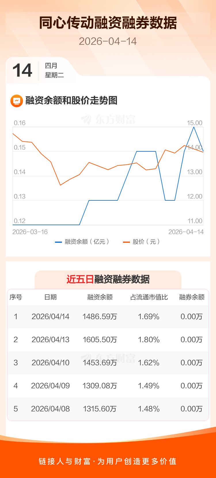 交易所最新数据显示,同心传动于2026年4月14日获融资买入7.58万元,融资偿还126.50万元,当日融资净偿还118.91万元。目前,该股融资余额1486.59万,占流通市值比例为1.69%。