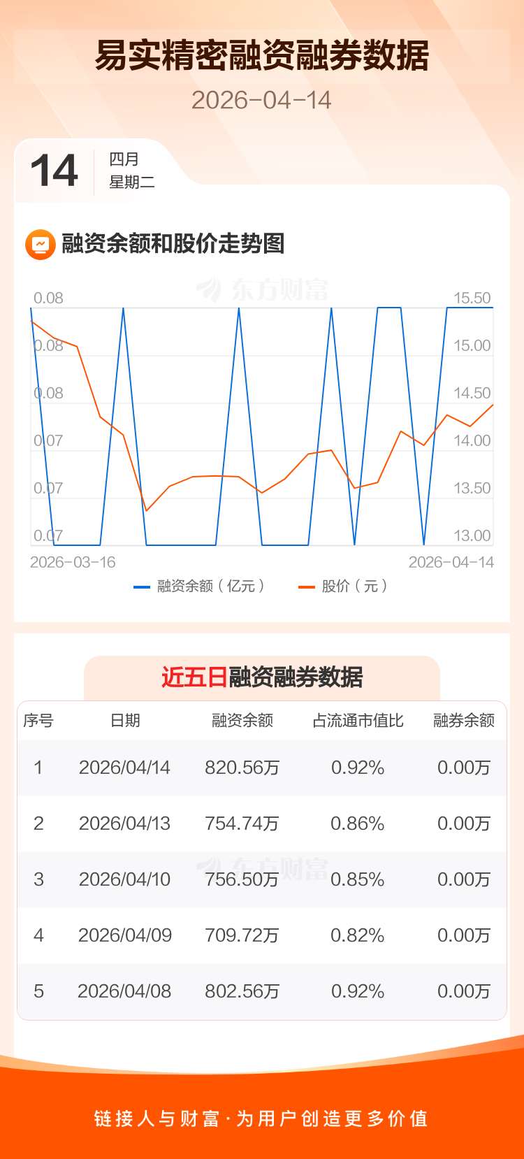 交易所最新数据显示,易实精密于2026年4月14日获融资买入147.41万元,融资偿还81.59万元,当日融资净买入65.82万元。目前,该股融资余额820.56万,占流通市值比例为0.92%。