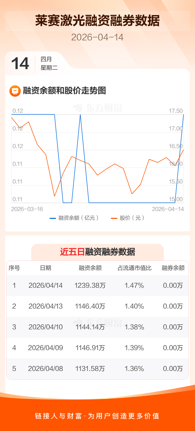 交易所最新数据显示,莱赛激光于2026年4月14日获融资买入119.33万元,融资偿还26.34万元,当日融资净买入92.99万元。目前,该股融资余额1239.38万,占流通市值比例为1.47%。