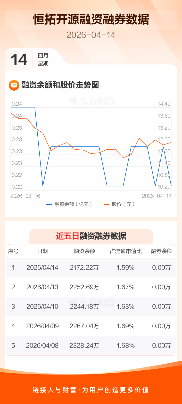 交易所最新数据显示,恒拓开源于2026年4月14日获融资买入29.76万元,融资偿还110.23万元,当日融资净偿还80.47万元。目前,该股融资余额2172.22万,占流通市值比例为1.59%。