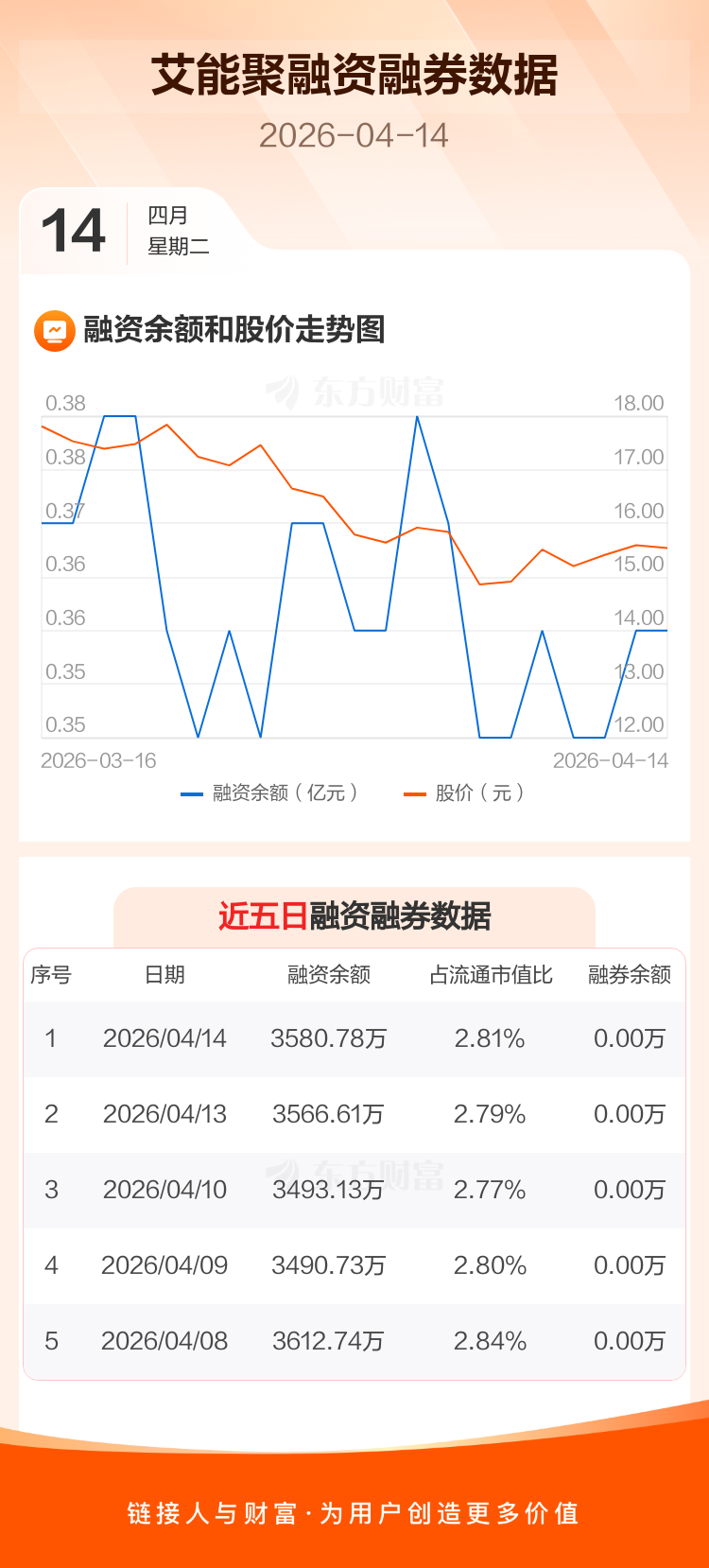 交易所最新数据显示,艾能聚于2026年4月14日获融资买入215.58万元,融资偿还201.41万元,当日融资净买入14.17万元。目前,该股融资余额3580.78万,占流通市值比例为2.81%。