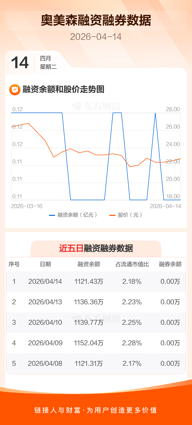 交易所最新数据显示,奥美森于2026年4月14日获融资买入13.77万元,融资偿还28.70万元,当日融资净偿还14.93万元。目前,该股融资余额1121.43万,占流通市值比例为2.18%。