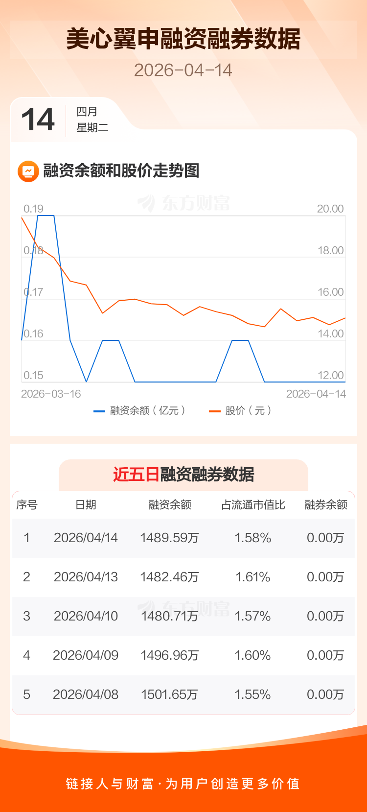 交易所最新数据显示,美心翼申于2026年4月14日获融资买入61.36万元,融资偿还54.24万元,当日融资净买入7.13万元。目前,该股融资余额1489.59万,占流通市值比例为1.58%。