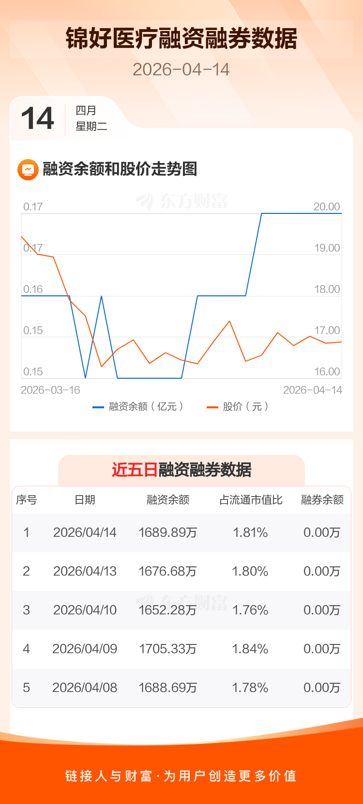 交易所最新数据显示,锦好医疗于2026年4月14日获融资买入29.43万元,融资偿还16.22万元,当日融资净买入13.21万元。目前,该股融资余额1689.89万,占流通市值比例为1.81%。