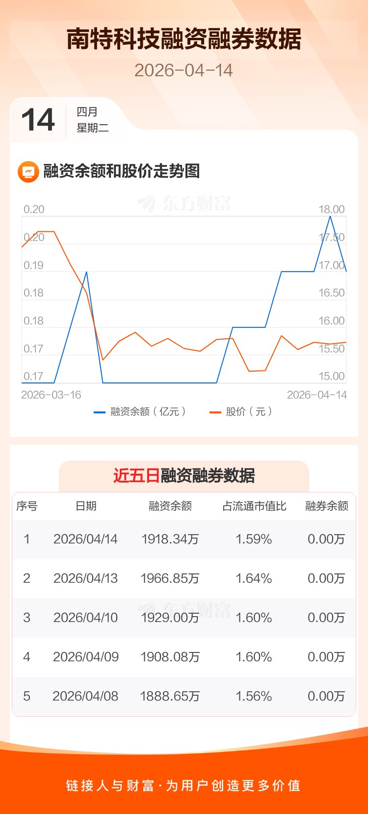 交易所最新数据显示,南特科技于2026年4月14日获融资买入110.65万元,融资偿还159.15万元,当日融资净偿还48.5万元。目前,该股融资余额1918.34万,占流通市值比例为1.59%。