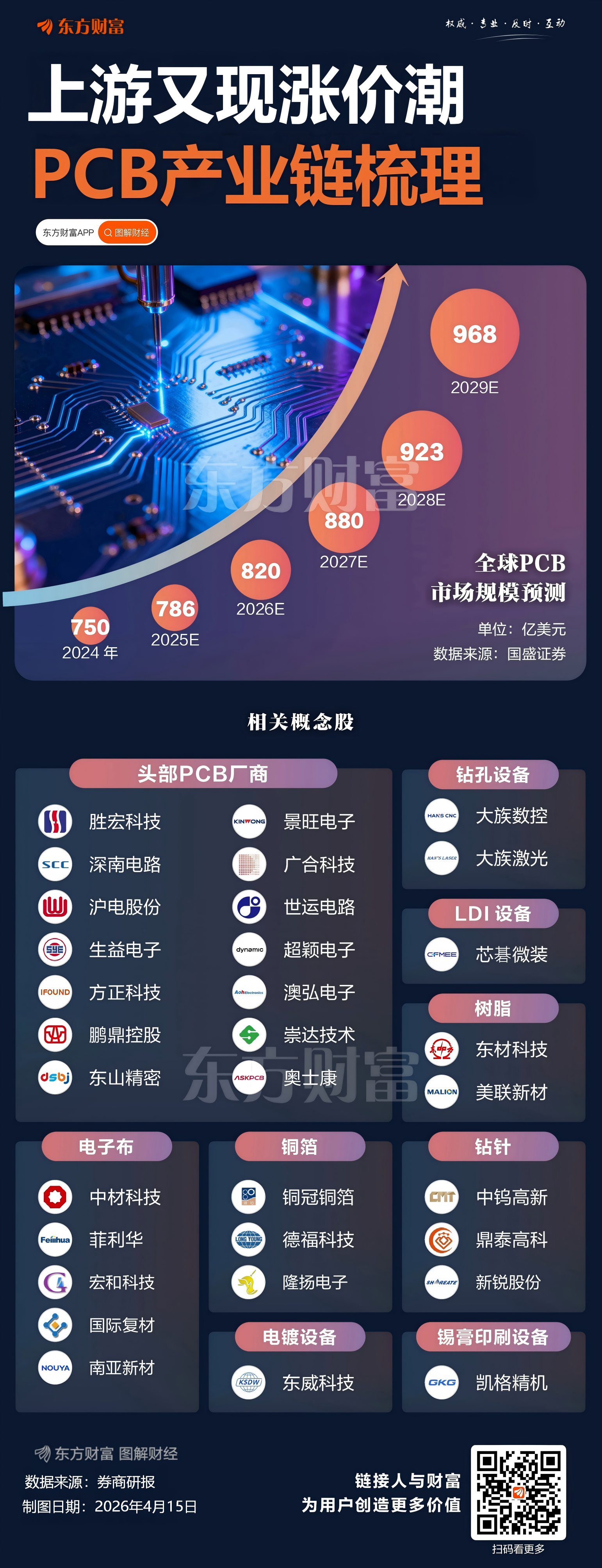西部证券4月8日研报指出,需求端看,高阶应用赛道展现极强增长动能:高阶HDI受益于AI终端集成化需求,预计2029年全球市场规模将达169亿美元;2030年全球汽车PCB市场有望增至122亿美元;而IC载板受下游存储高景气驱动,BT载板材料交期已拉长至16-20 周,缺口为国内厂商提供导入机遇。