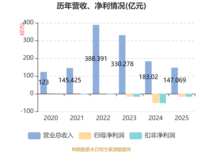 中证智能财讯 *ST中地(000736)4月15日披露2025年年度报告。2025年,公司实现营业总收入147.07亿元,同比下降19.64%;归母净利润亏损17.1亿元,上年同期亏损51.79亿元;扣非净利润亏损17.21亿元,上年同期亏损53.22亿元;经营活动产生的现金流量净额为-2.78亿元,上年同期为31.75亿元;报告期内,*ST中地基本每股收益为-2.29元,加权平均净资产收益率为75.36%。