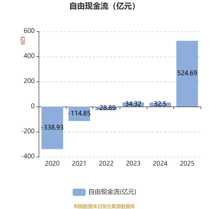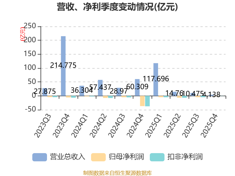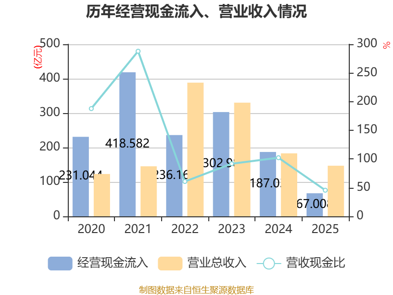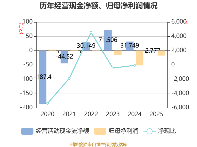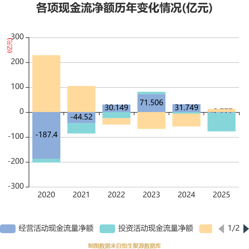 截至2025年,公司经营活动现金流净额为-2.78亿元,同比减少34.53亿元;筹资活动现金流净额12.53亿元,同比增加64.16亿元;投资活动现金流净额-74.79亿元,上年同期为-6.15亿元。