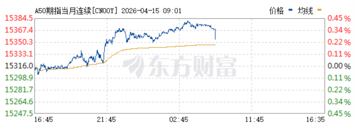 上证报中国证券网讯 4月15日,富时中国A50指数期货在上一个交易日夜盘收涨0.35%的基础上高开。截至9时01分,主力合约涨0.29%。