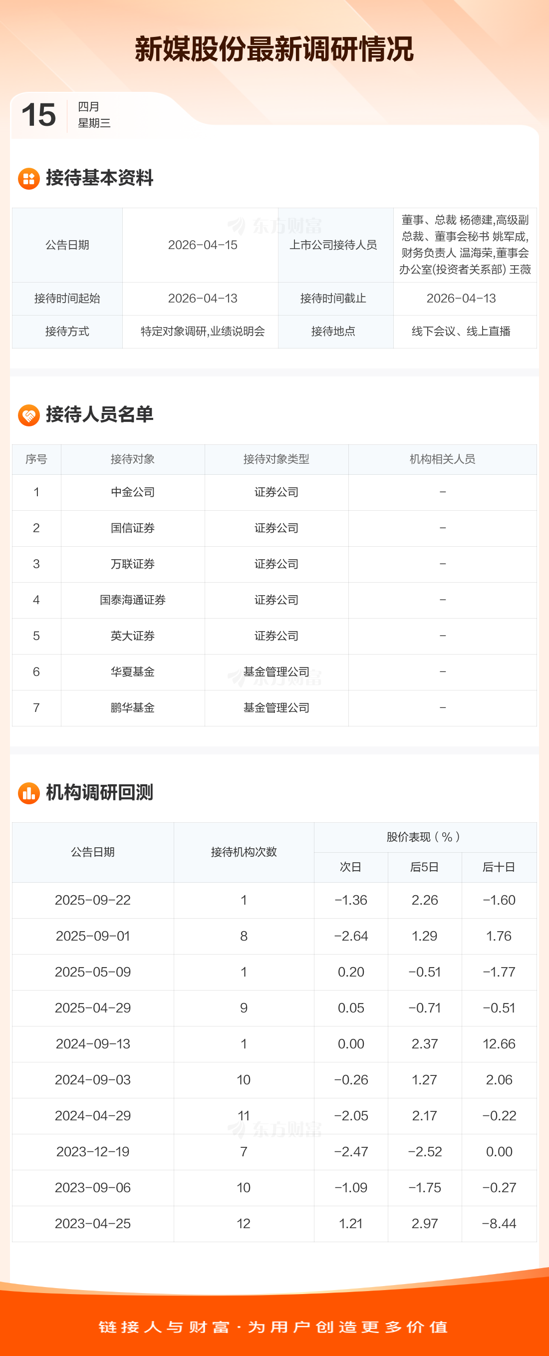 新媒股份4月15日公告称,4月13日接待中金公司等7家机构调研。接待人员包括董事、总裁 杨德建,高级副总裁、董事会秘书 姚军成,财务负责人 温海荣,董事会办公室(投资者关系部) 王薇。