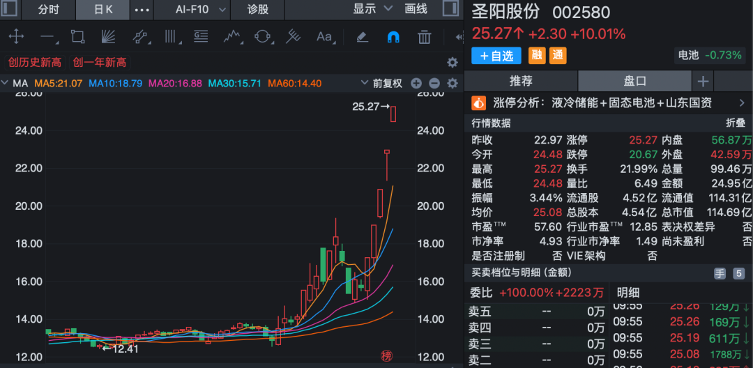 电池产业链反复活跃,圣阳股份(002580)涨停,走出5连板。石大胜华、中一科技、铜冠铜箔、德福科技、嘉元科技跟涨。