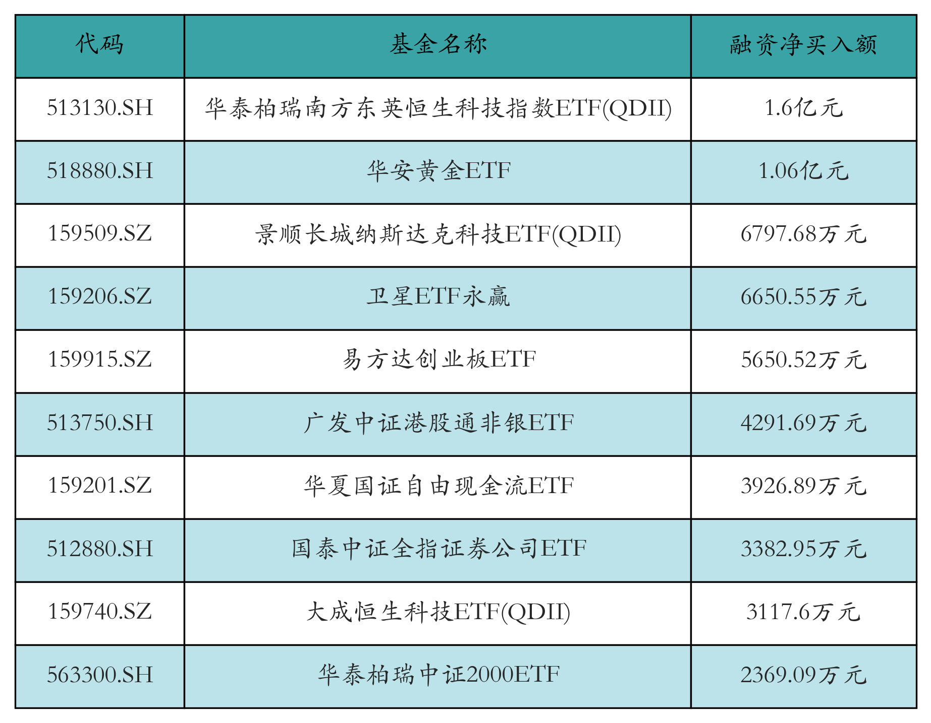 4月14日ETF融资净买入额前三位分别为:华泰柏瑞南方东英恒生科技指数ETF(QDII)(1.6亿元)、华安黄金ETF(1.06亿元)和景顺长城纳斯达克科技ETF(QDII)(6797.68万元),前10具体见下表: