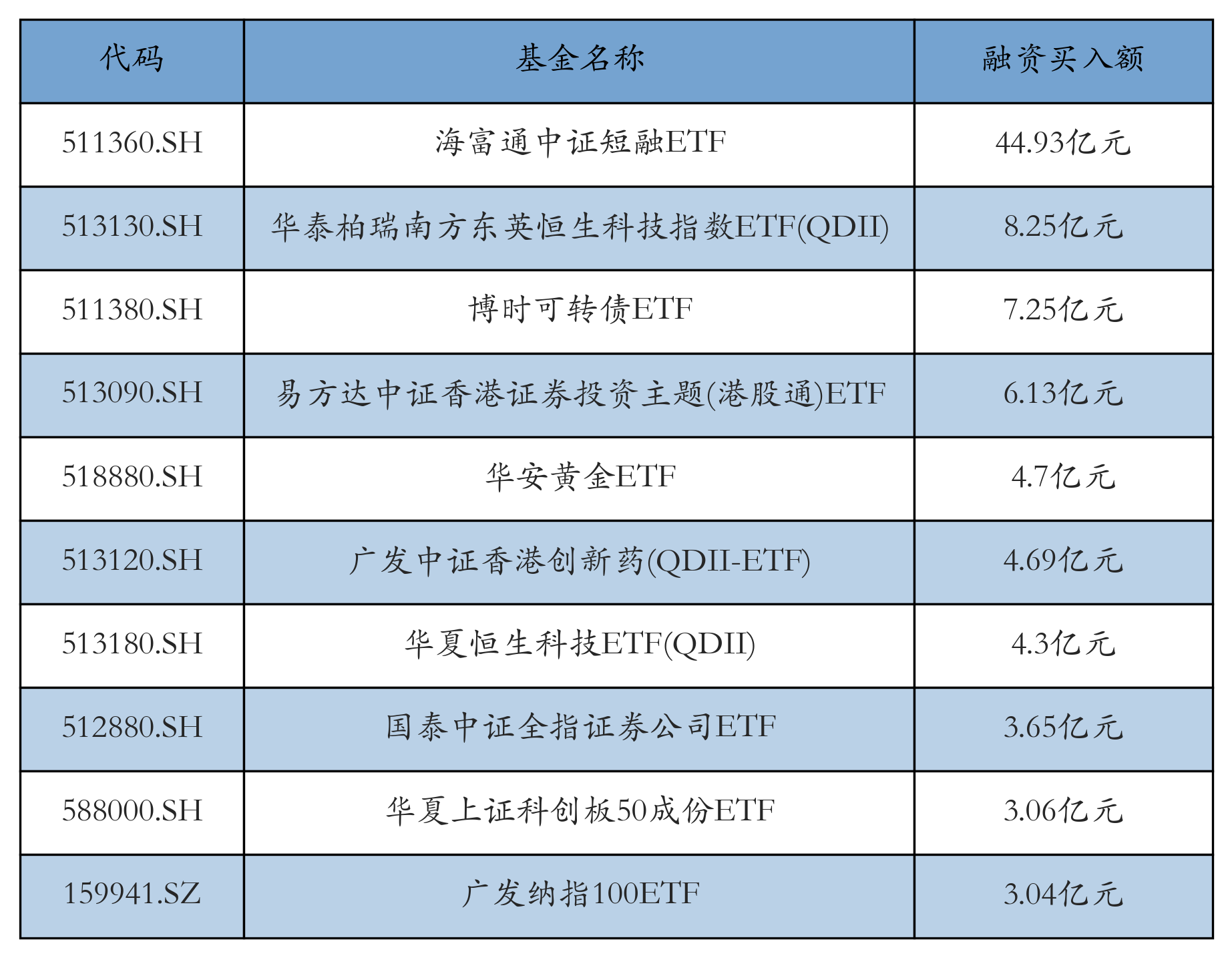 4月14日ETF融资买入额前三位分别为:海富通中证短融ETF(44.93亿元)、华泰柏瑞南方东英恒生科技指数ETF(QDII)(8.25亿元)和博时可转债ETF(7.25亿元),前10具体见下表: