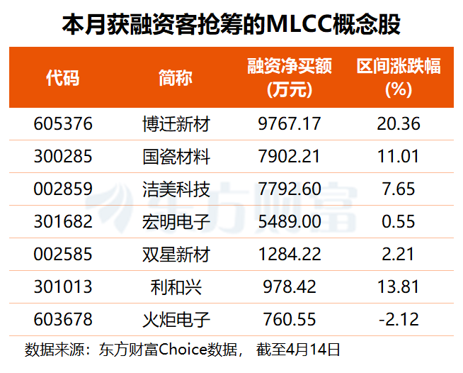 4月以来,仅火炬电子下挫约2%,其余MLCC概念股均录得股价上涨,博杰股份、三环集团月内涨幅均在20%以上。叠加资金来看,博迁新材本月获融资客抢筹0.98亿元,国瓷材料、洁美科技均获杠杆资金加仓近0.8亿元,宏明电子融资净买额也达5500万元。