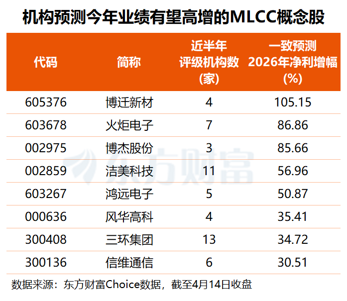 未来增长潜力方面,东方财富Choice数据显示,根据2家及以上机构预测,共8只MLCC概念股今年业绩有望增逾三成,其中,博迁新材2026年净利或实现翻倍增长,火炬电子、博杰股份预测净利增幅均超85%,洁美科技、鸿远电子也有望实现五成以上业绩增长。