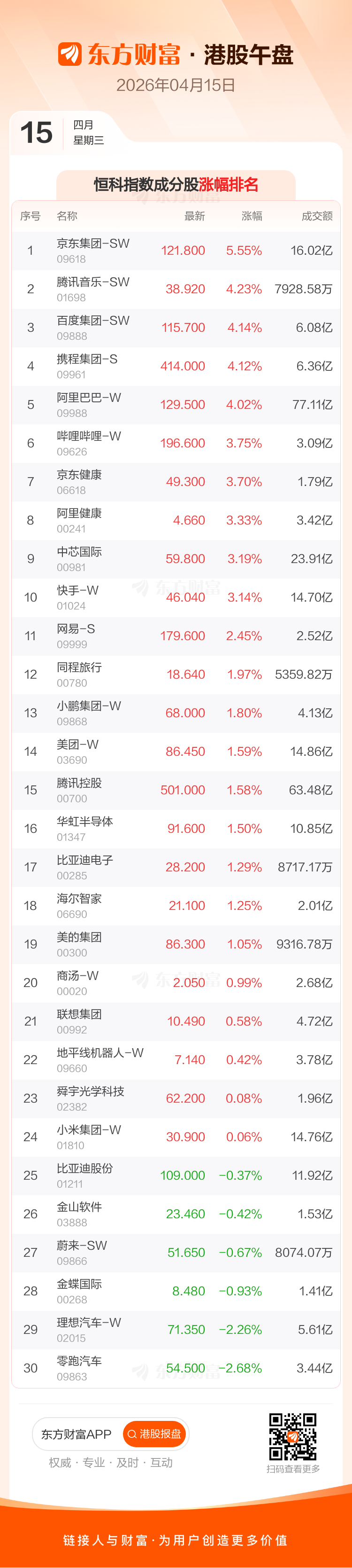 港股4月15日午盘走高,恒生指数收报26069.51点,涨197.19点,涨幅0.76%;恒生科技指数收报4943.18点,涨91.22点,涨幅1.88%。恒生指数成分股中老铺黄金、京东集团-SW、百度集团-SW涨幅居前,新东方-S、中国石油股份、李宁跌幅靠前。恒生科技指数成分股中京东集团-SW、腾讯音乐-SW、百度集团-SW涨幅居前,零跑汽车、理想汽车-W、金蝶国际跌幅靠前。