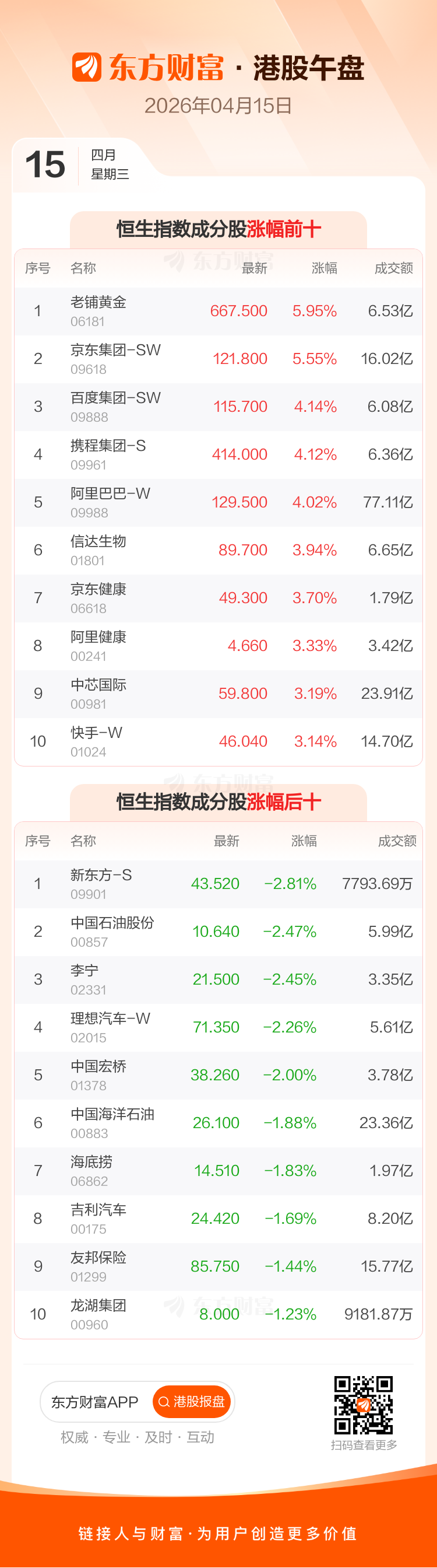 4月15日港股午盘:恒指涨0.76% 老铺黄金领涨成分股