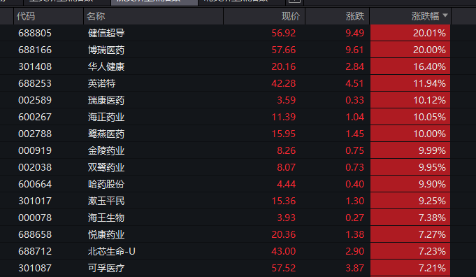 行业板块和赛道方面,若按照申万一级行业划分,医药生物板块领涨,板块涨幅超过1%。键信超导、博瑞医药“20cm”涨停,华人健康、英诺特涨幅超过10%,瑞康医药、海正药业、鹭燕医药、金陵药业等多股涨停。