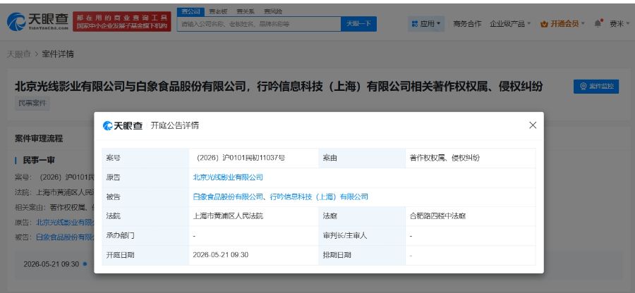 天眼查App显示,近日,北京光线影业有限公司与白象食品股份有限公司、小红书关联公司行吟信息科技(上海)有限公司相关著作权权属、侵权纠纷案件新增一则开庭公告,原告为北京光线影业有限公司,该案将于5月21日在上海市黄浦区人民法院开庭审理。