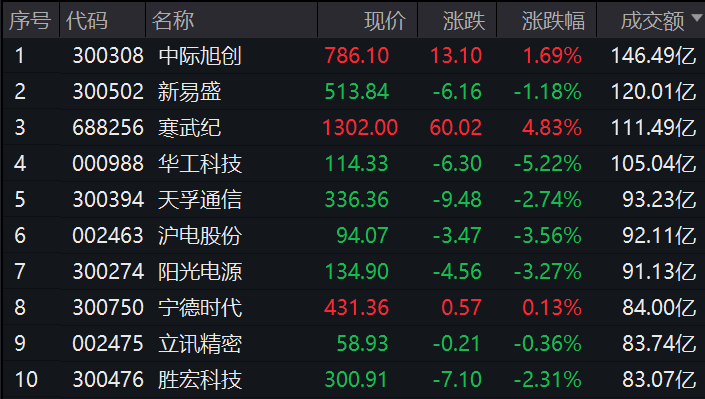 个股方面,中际旭创半日成交额超146亿元居首,新易盛、寒武纪、华工科技成交额靠前。