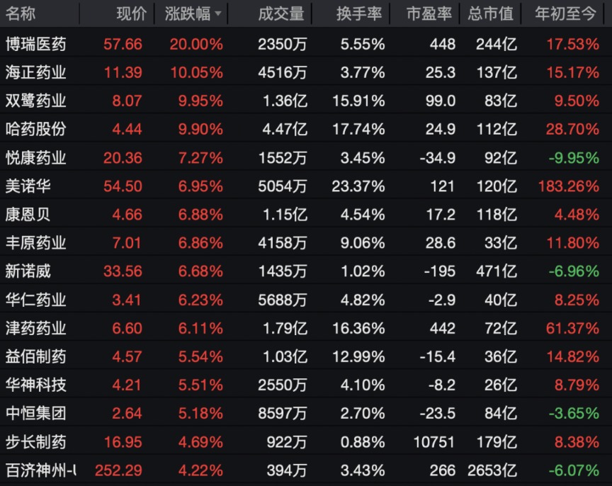 医药板块持续走强,博瑞医药20cm涨停,海正药业、双鹭药业、哈药股份等多股涨停。
