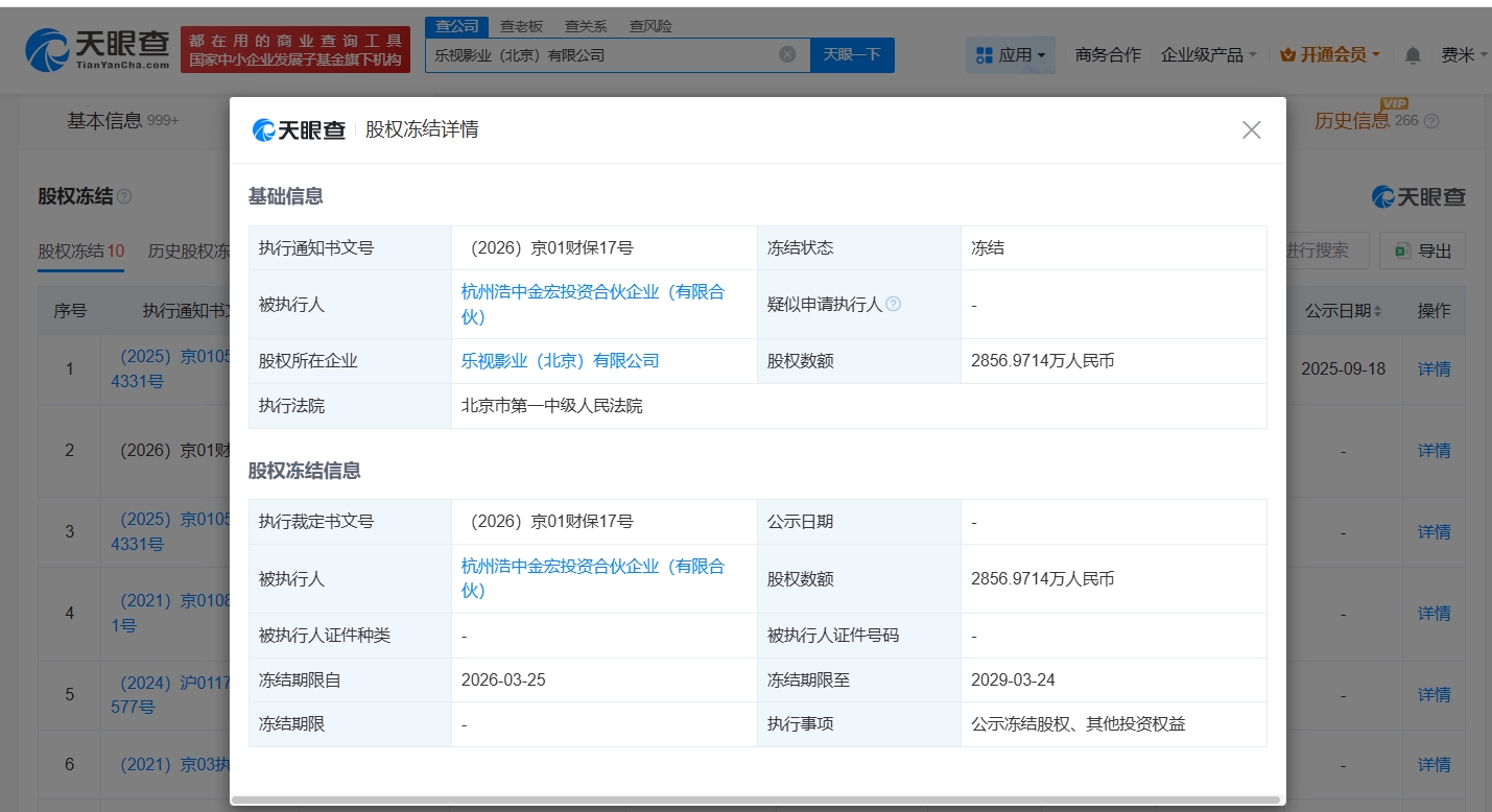 南方财经4月15日电,天眼查法律诉讼信息显示,近日,乐视影业(北京)有限公司新增一则股权冻结信息,被执行人为杭州浩中金宏投资合伙企业(有限合伙),冻结股权数额2856万余元,执行法院为北京市第一中级人民法院。该公司成立于2011年12月,法定代表人为付大明,注册资本约8.4亿人民币,经营范围包括电影片发行、投资管理、资产管理等,由天津润通企业管理有限公司、北京思伟股权投资管理中心(有限合伙)、杭州浩中金宏投资合伙企业(有限合伙)等共同持股,其中杭州浩中金宏投资合伙企业(有限合伙)的持股比例约为3.4%。