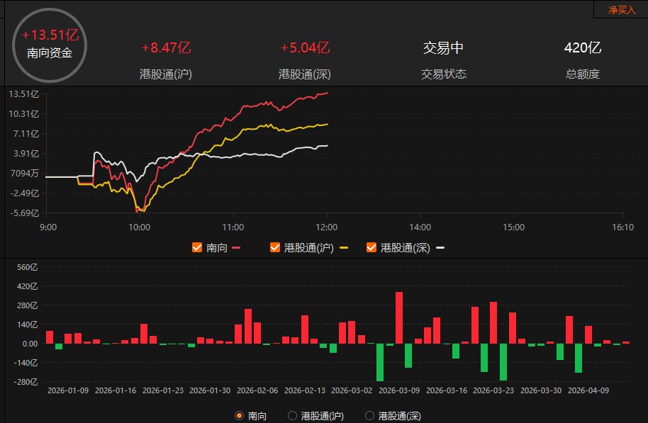 早盘南向资金净买入13.51亿港元。