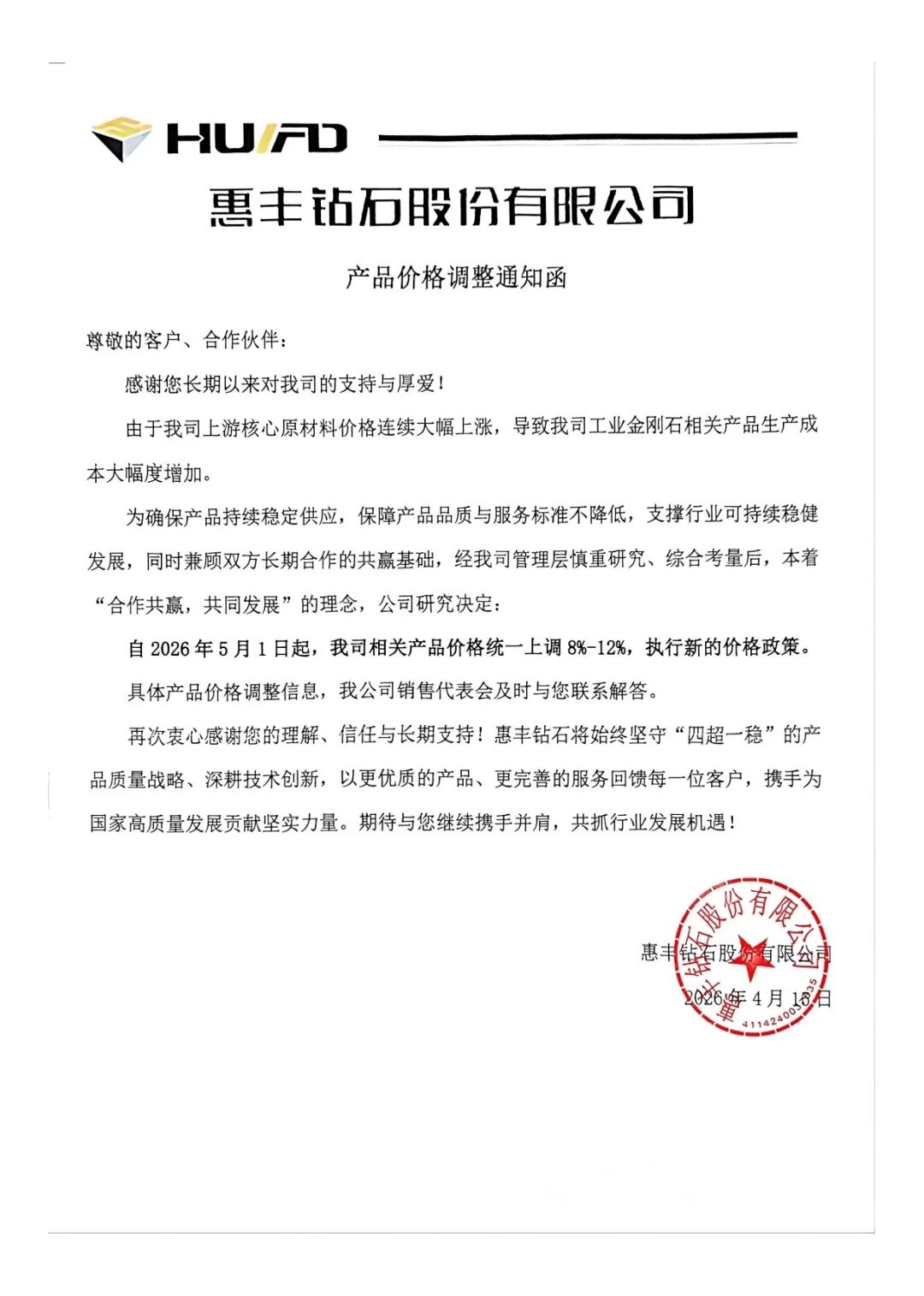 惠丰钻石宣布:5月1日起上调工业金刚石价格8%~12%