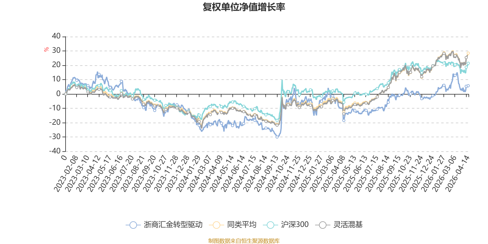 截至4月14日,浙商汇金转型驱动近三个月复权单位净值增长率为1.82%,位于同类可比基金482/1287;近半年复权单位净值增长率为3.81%,位于同类可比基金823/1286;近一年复权单位净值增长率为22.23%,位于同类可比基金789/1286;近三年复权单位净值增长率为-7.08%,位于同类可比基金1103/1286。