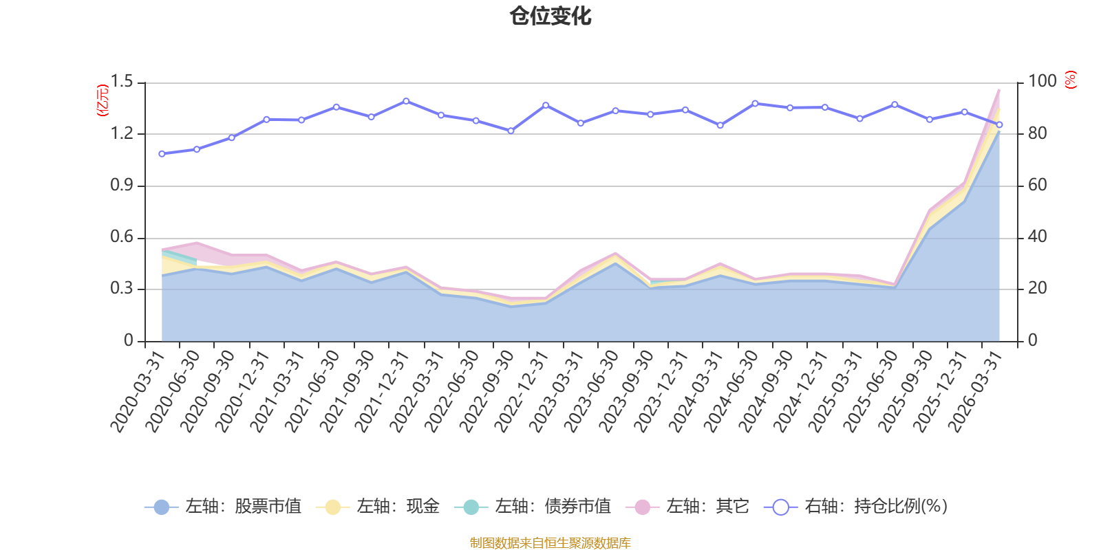 据定期报告数据统计,近三年平均股票仓位为88.15%,同类平均为72.6%。2021年末基金达到92.82%的最高仓位,2020年一季度末最低,为72.44%。
