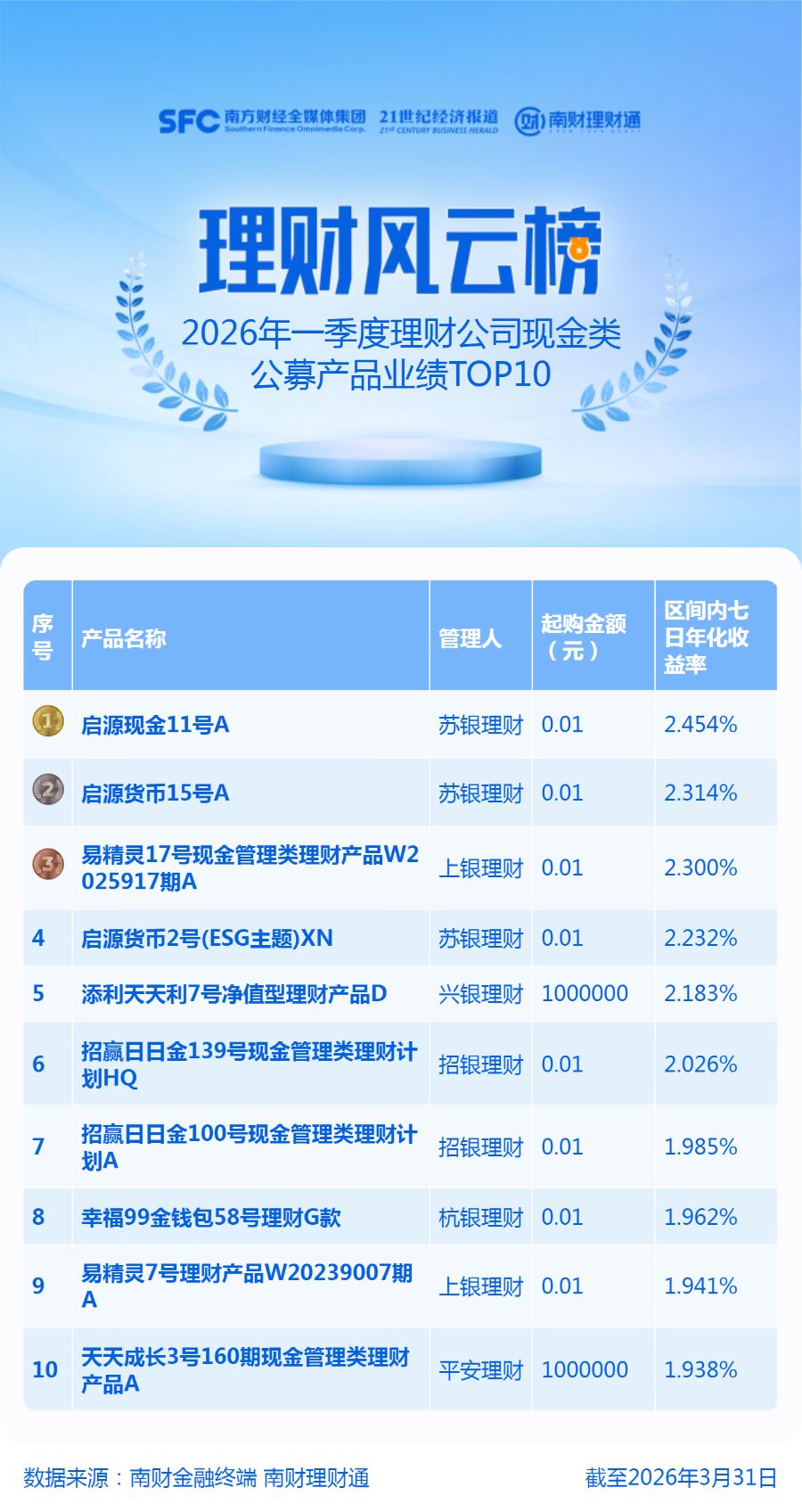 产品统计范围为理财公司发行的公募现金类产品,统计截止日期为2026年3月31日,统计区间为2026年一季度(1月1日至3月31日,下同)。