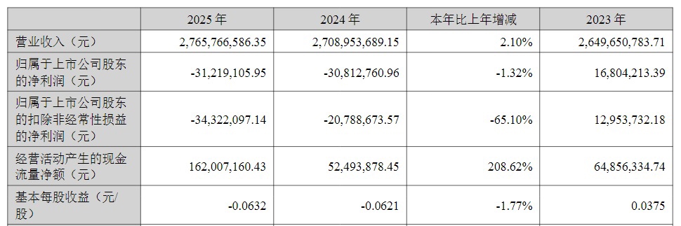 吉峰科技(300022)4月14日晚间发布2025年年度报告,公司全年实现营业收入27.66亿元,同比增长2.09%;实现归属于上市公司股东的净利润为-3121.91万元,同比下降1.32%;基本每股收益为-0.06元/股。