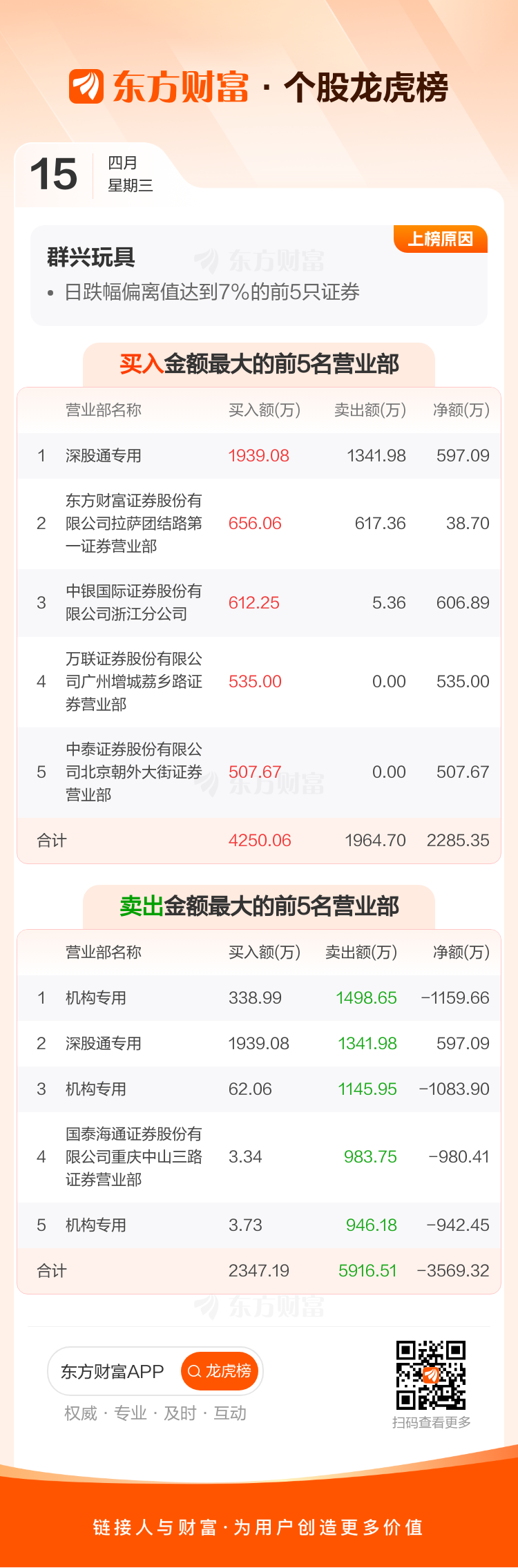 交易所2026年4月15日公布的交易公开信息显示,群兴玩具因成为日跌幅偏离值达到7%的前5只证券上榜。群兴玩具当日收报6.51元,涨跌幅-9.96%,偏离值-9.29%,换手率18.06%,成交额7.05亿。